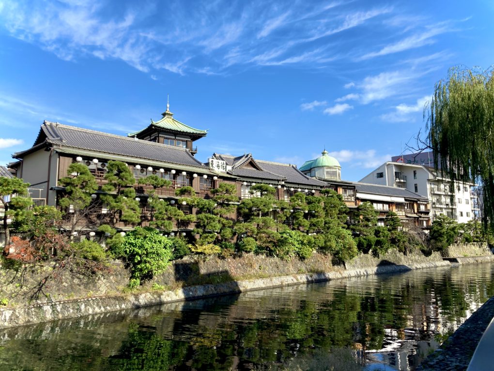 - 川沿いの立地も東海館の魅力の一つ。四季折々の自然と調和した景色を楽しめます。