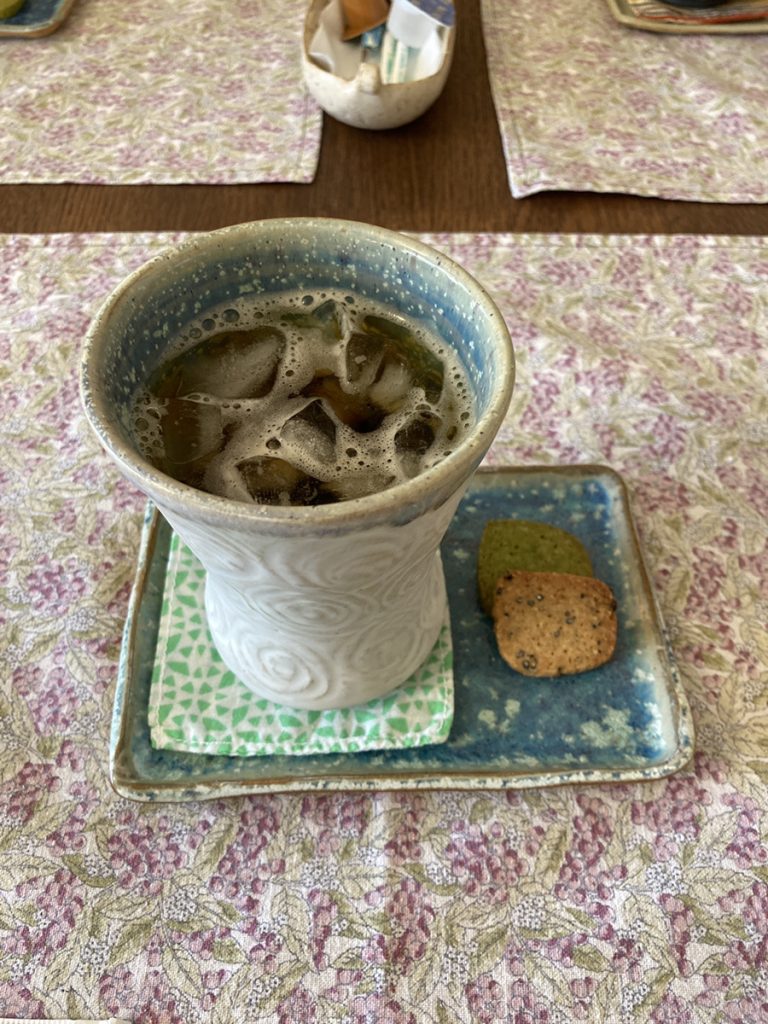 食器も一つ一つ形や柄が異なり、視覚的な楽しみも提供してくれます。最後に出されたアイスティーに添えられたクッキーは、甘すぎず絶妙な味わいで、食事の締めくくりにぴったり。